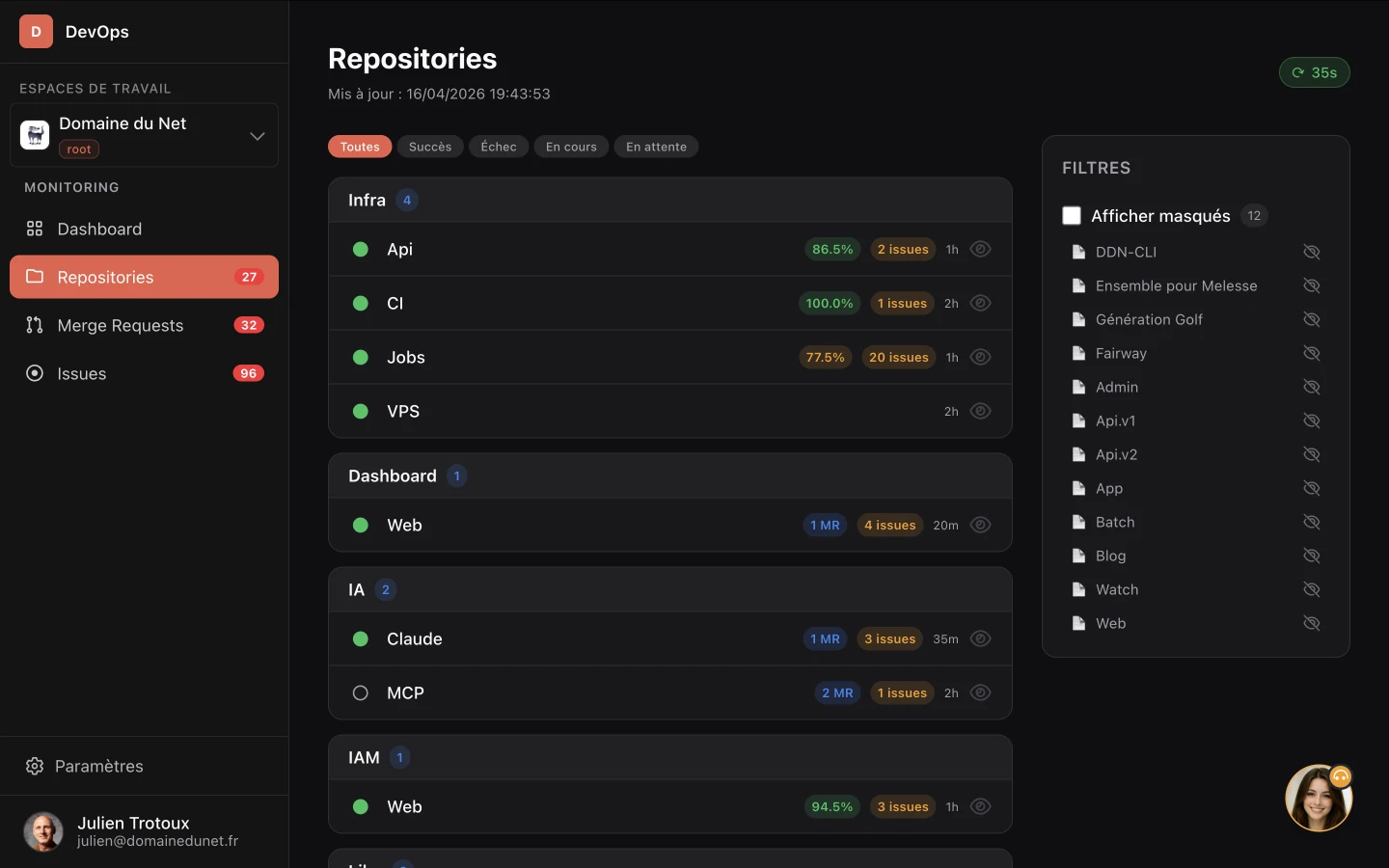 En quelques mois, Domaine du Net a structuré une approche concrète pour transformer l'IA en outils réellement utiles : publication, support, analytics, génération de pages, orchestration et industrialisation. Cette page présente ce qui a été construit, ce qui est déjà en production, et comment cette méthode peut être mise au service d'autres organisations.