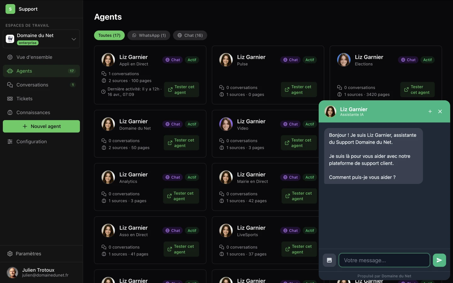 Brique de support IA multi-canal. Répondez sur votre site, via WhatsApp ou par email à partir d'une vraie base de connaissance métier, avec ticketing et personnalisation. Le sujet n'est pas le chatbot gadget — c'est la capacité à fournir une réponse utile, contextualisée et immédiate.